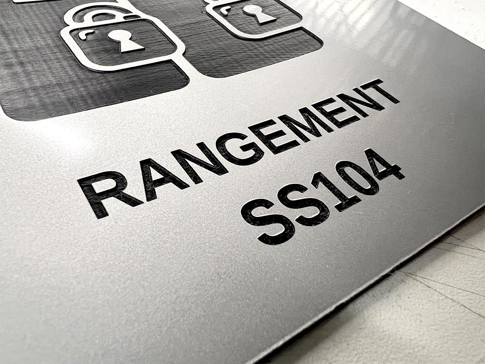 La découpe et la gravure au laser permettent des formes personnalisées, des pictogrammes techniques, des polices très fines, des perforations ou adhésifs déjà appliqués.